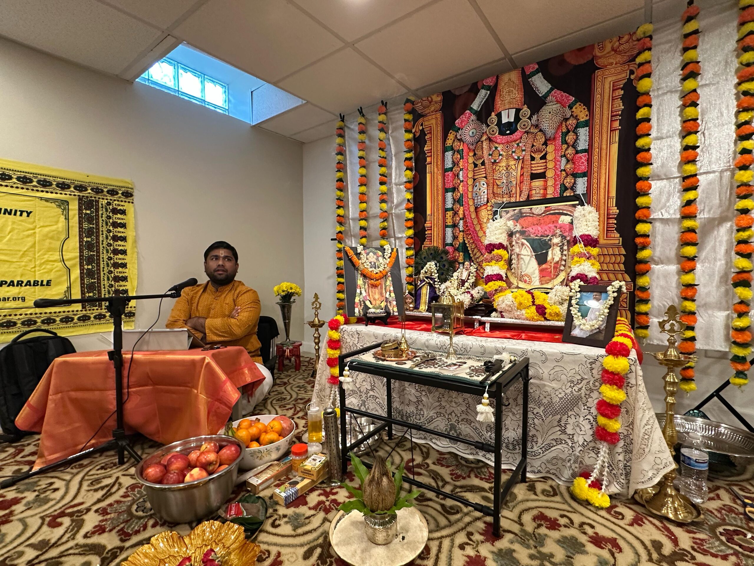 Sri Gadadharan Ji, an ardent disciple of HH Maharanyam Sri Sri Muralidhara Swamiji, visited Michigan and offered three uplifting discourses over two blessed days. Having served Sri Swamiji from a young age and learned Bhagavata Dharma directly from him, Sri Gadadharan Ji brought to devotees the essence of our scriptures in a simple, profound, and transformative manner.