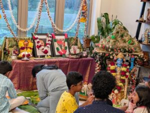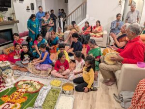 A sumptuous bhog offering of various rice preparations, kheer, kalakand, and halwa was lovingly presented to Sri Jaganmohan. Annakoot utsav in the form of Krishna mesmerized everyone. The Gopakuteeram children from the neighborhood added to the joy of the celebration with their melodious bhajans and namavalis.