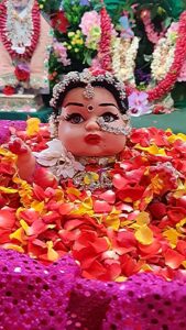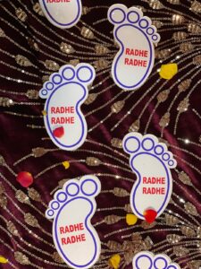The Namadwaar was lovingly decorated by devotees with balloons, the altar was beautifully decorated to create a divine and serene atmosphere of a vibrant garden, symbolizing the divine abode of Radha-Krishna. A specially crafted doll of Sri Radharani was seated in a lotus-shaped basket, captivating the hearts of all who beheld it. The highlight of the evening was the rare blessing of having darshan of the holy feet of Sri Radharani, which devotees look forward to every year on this auspicious day.