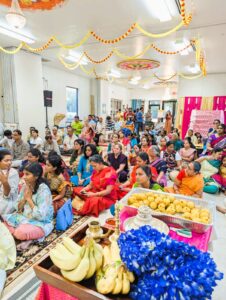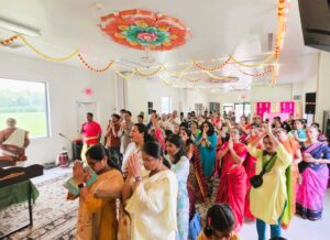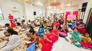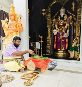 As ordained by Sri Swamiji, Akhanda Mahamantra kirtan was performed through the day, with the chanting of Atma Nivedanam stotram every hour (a stotram of surrender to Lord Srinivasa). There was a continuous flow of devotees throughout the day, and over 300 devotees visited the temple that day to have darshan of Sri Aishwarya Srinvasa Perumal and participated in the Mahamantra chanting. Laddu prasadam was distributed to devotees all day.