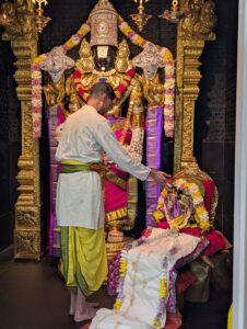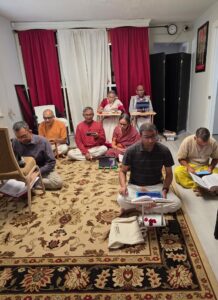 By the grace of Sri Aishwarya Srinivasa Perumal and blessings of Sri Swamiji, a divine 3-day celebration was organized at the temple on the auspicious occasion of Sri Chaitanya Mahaprabhu Jayanthi and 16th anniversary of Houston Namadwaar. The celebrations began on Friday evening with the nectarine katha of the birth of Sri Chaitanya Mahaprabhu by Sri Aravindji followed by Pada Pooja of Sri Radha Devi. During the mornings of Saturday and Sunday, devotees took turns to do the Parayanam of Dasama Skandam from Srimad Bhagavatam.